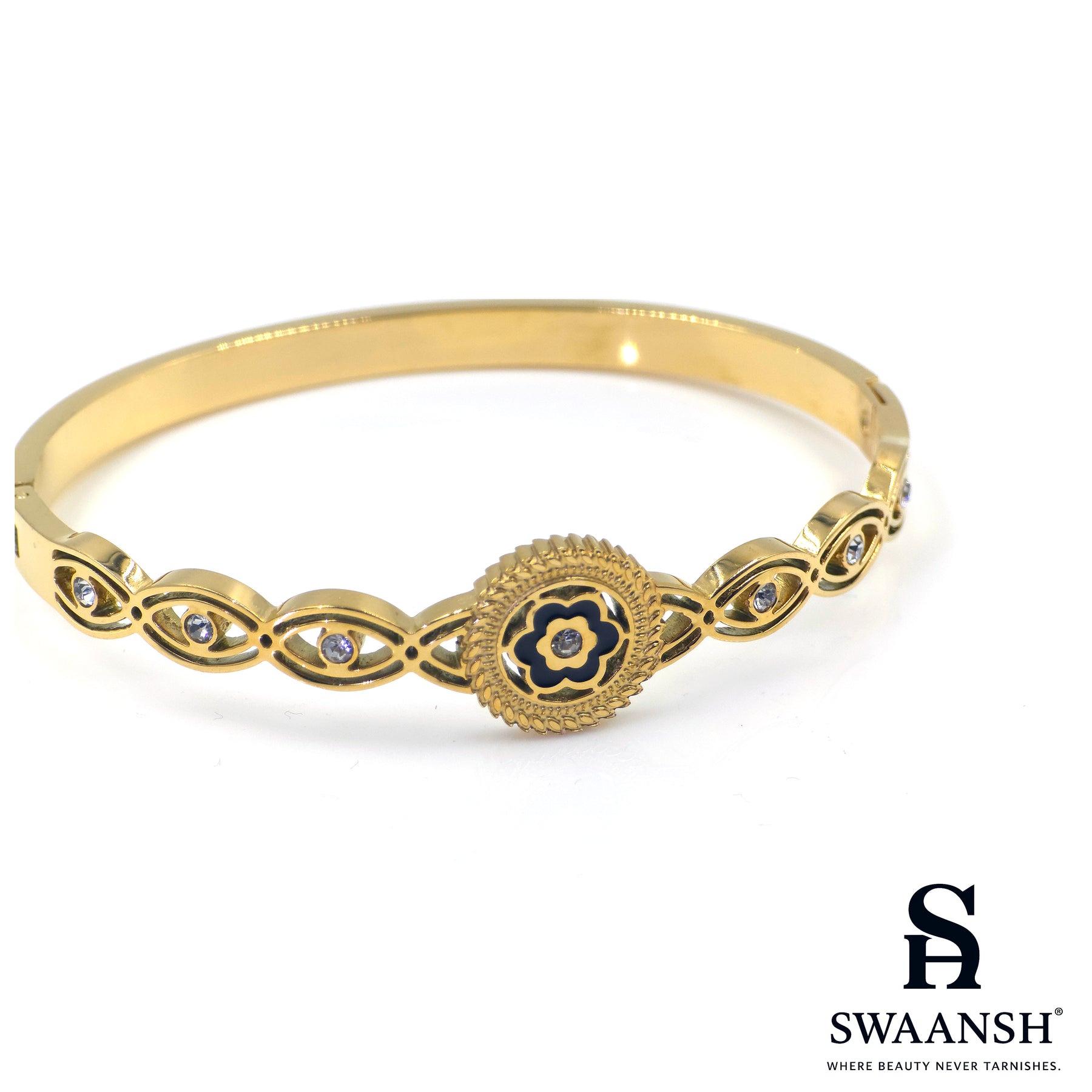 The Lustre Bloom Bracelet is a celebration of intricate floral artistry, crafted in a radiant gold finish that glows from every angle. Its signature design features a centre medallion with a stylized blossom motif, surrounded by delicate leaf-shaped crystal inlays — bringing balance, grace, and harmony to your wrist.