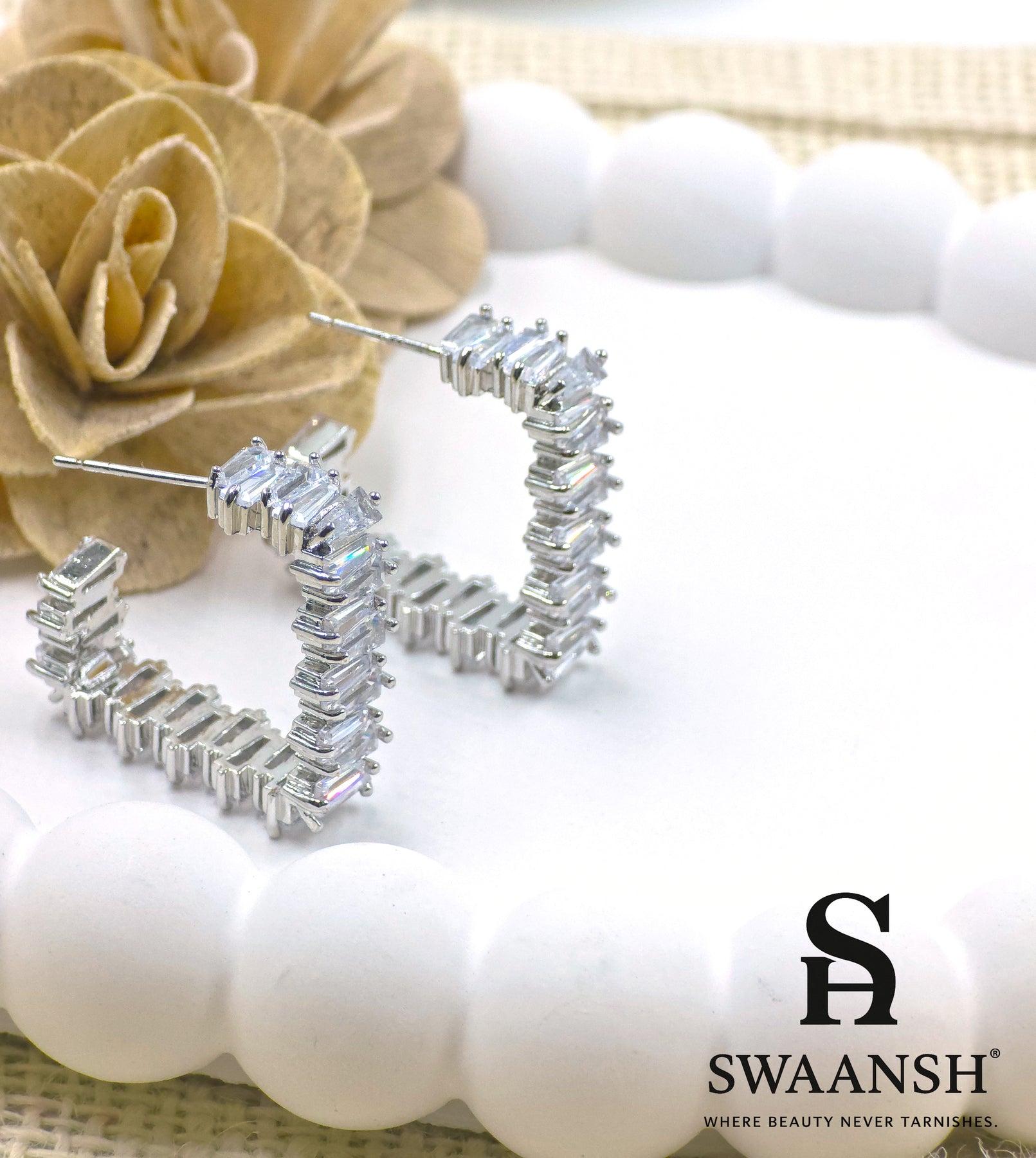 Silver semi-hoop earrings with baguette-cut stones placed on a luxury floral setup – Swaansh
