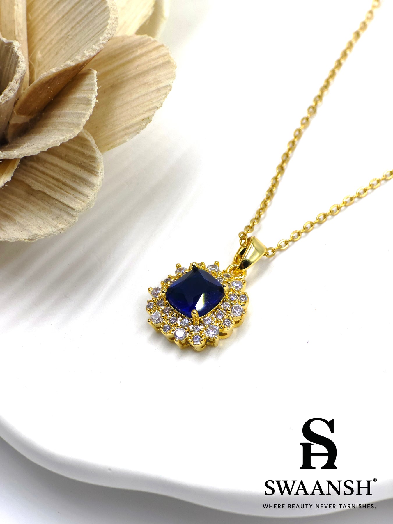The Midnight Royale Pendant is a tribute to regal beauty — centered with a rich sapphire-blue crystal surrounded by a double halo of white pavé stones. Its cushion-cut silhouette exudes depth and poise, while the high-polish gold frame adds just the right amount of grandeur. A perfect blend of sophistication and sparkle, this pendant is made for graceful evenings and memorable moments.