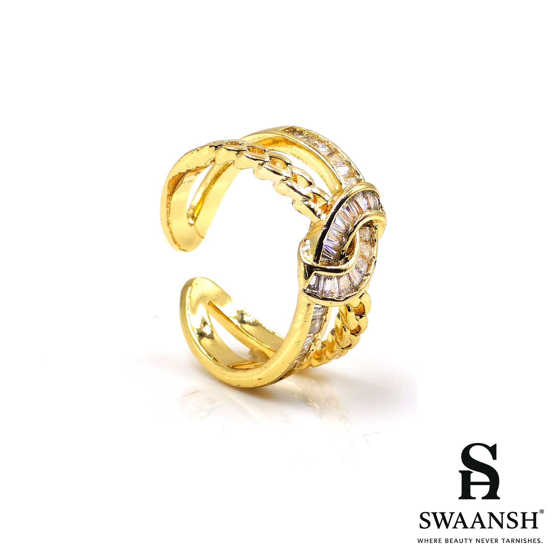 Gold statement ring with double chain and baguette zircons – Link Luxe Ring by Swaansh