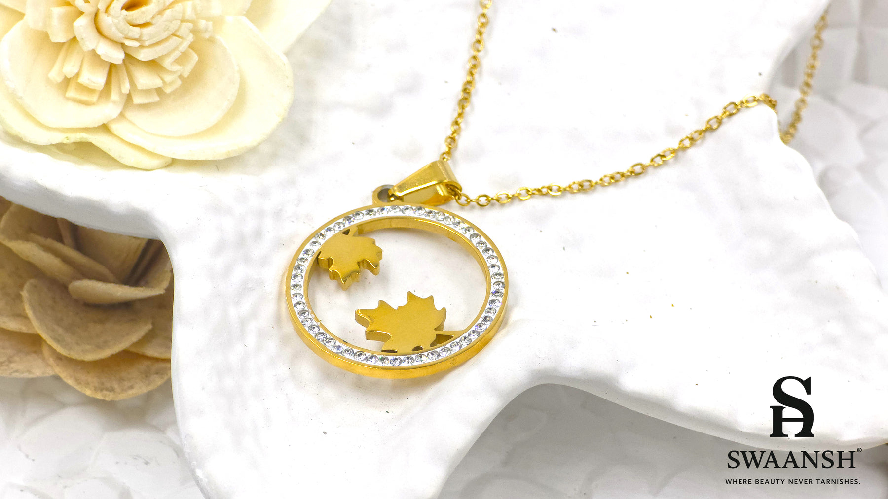 The Autumn Radiance Pendant is a graceful tribute to nature’s elegance — featuring two golden maple leaves suspended inside a crystal-lined circular frame. With its open silhouette and delicate detailing, this pendant captures the feeling of fall in motion while adding just the right touch of sparkle for everyday sophistication.