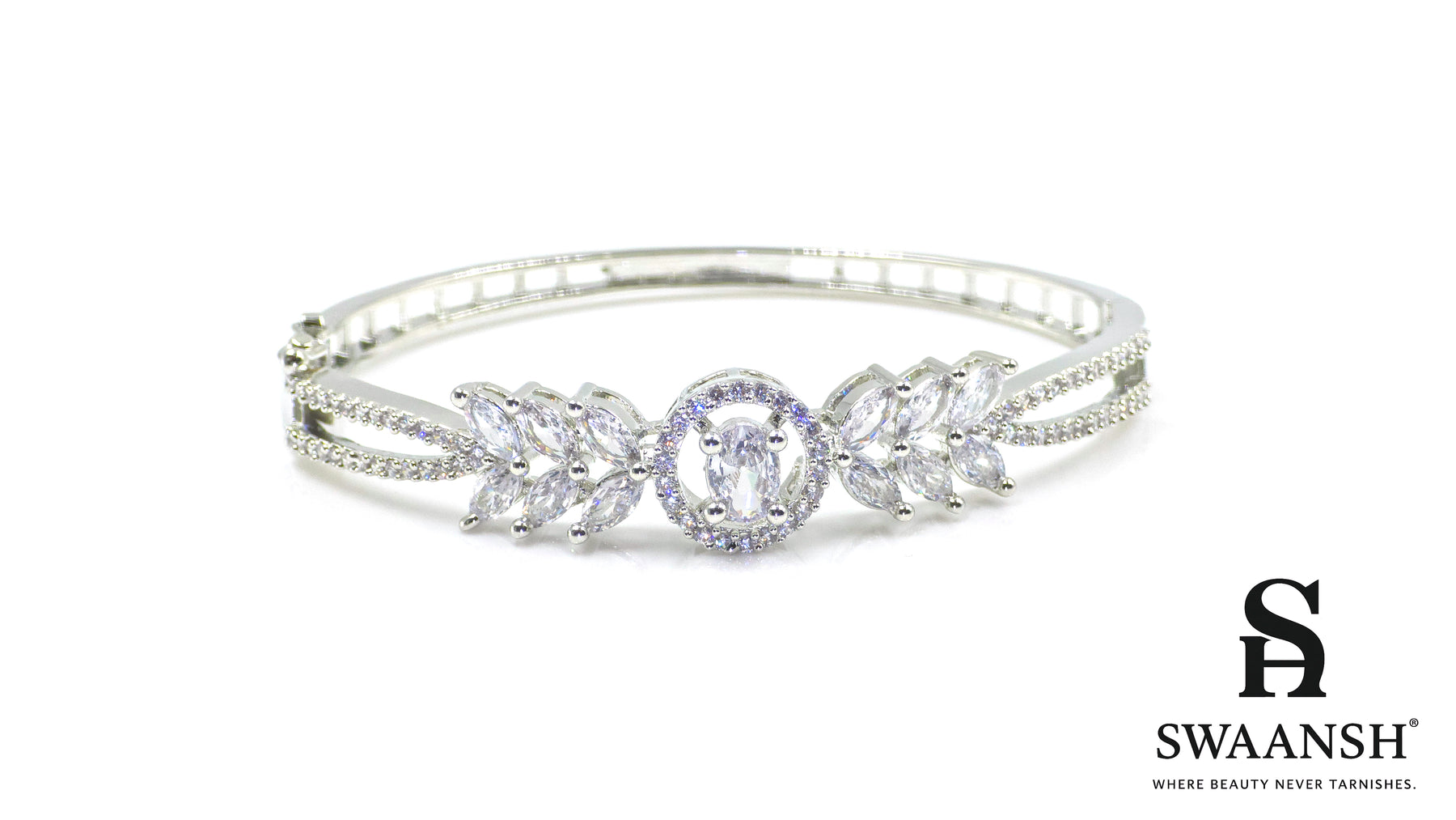Understated yet majestic, the Celesté Regal Crown Bracelet brings the grace of royalty into everyday elegance. Crafted in anti-tarnish silver plating, the oval centre CZ is framed by a halo and flanked with twin clusters of marquise stones, forming a delicate crown-like pattern. The sleek, double-lined band shimmers with micro CZs, making it a perfect pick for weddings, gifting, or minimal luxe styling.