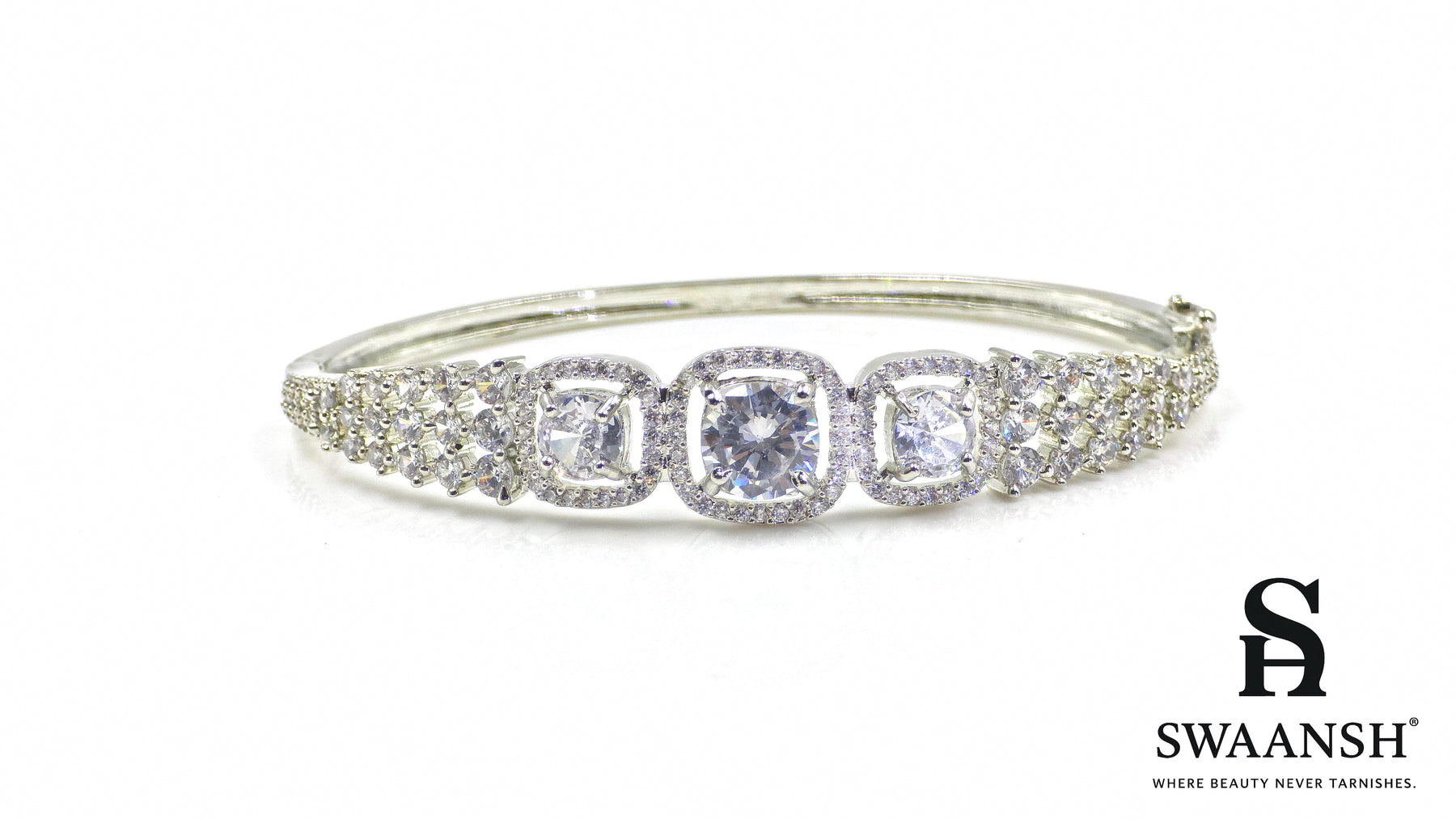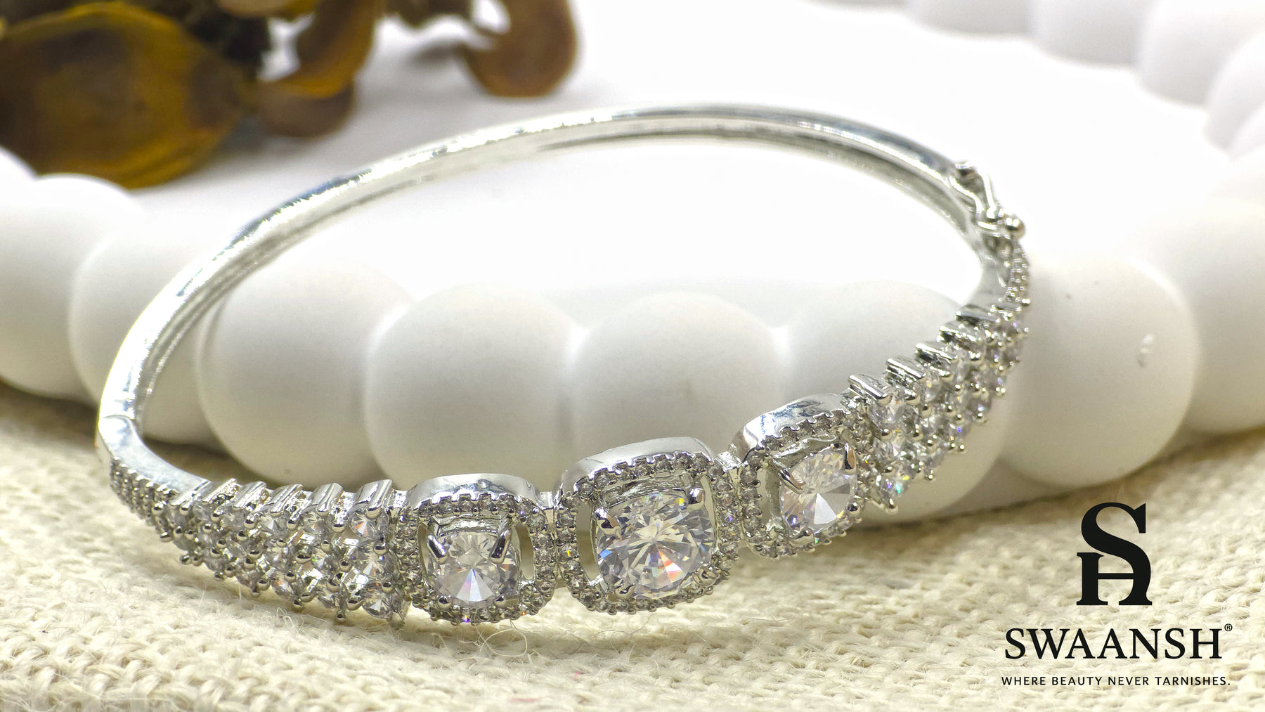Introducing the Crown Radiance Bracelet, a refined statement of queen-like elegance. Crafted in anti-tarnish silver-toned stainless steel, this bracelet is crowned with three bold cushion-cut CZ stones, each framed in a sparkling halo. The tapering shoulders are adorned with meticulously placed smaller stones, giving the bracelet a rich, royal silhouette. Itβs an iconic companion for grand occasions, wedding attire, and modern festive ensembles.