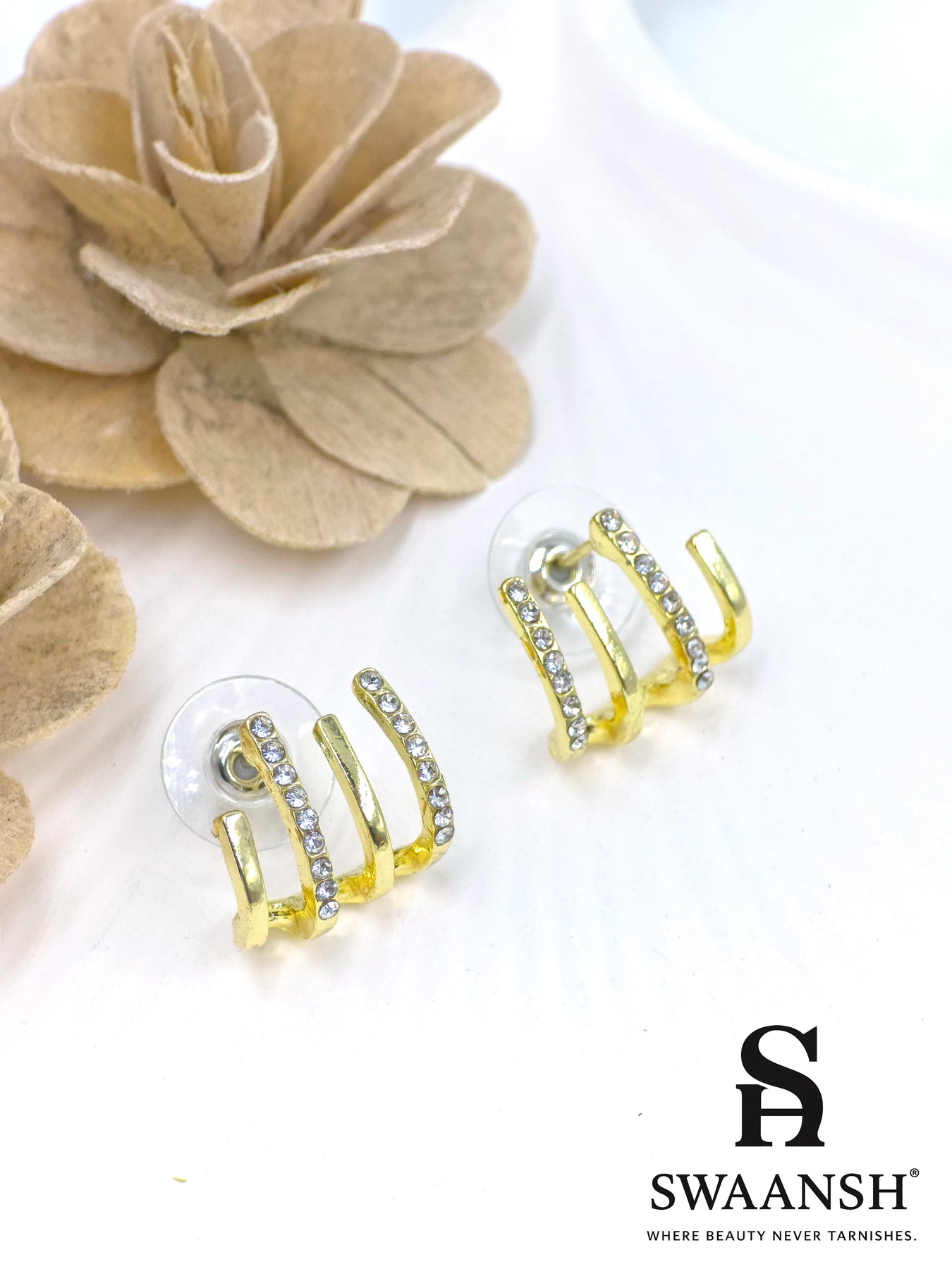 A fusion of hoops and studs, the Crystal Arc Multi-Hoop Studs are made for the woman who doesn't settle for ordinary. Featuring three parallel gold arcs—each lined with fine white crystals—this design gives the illusion of multiple ear piercings in a single, comfortable stud. Its edgy layout pairs the elegance of sparkle with the strength of geometric design, making it a standout accessory for modern styling.